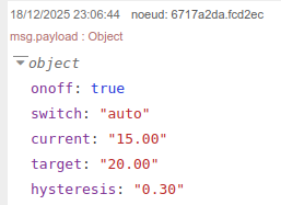 Le nœud possède une entrée (4 topic-payloads)et une sortie, (object with 4 payloads)comme décrit ci-dessous. La sortie contient onoffune valeur booléenne indiquant si le chauffage doit être allumé ou éteint. Si l'hystérésis est active, la valeur onoffestnull :
