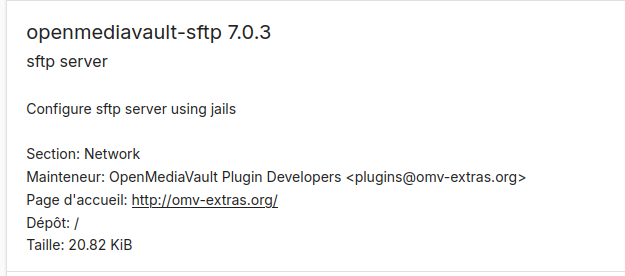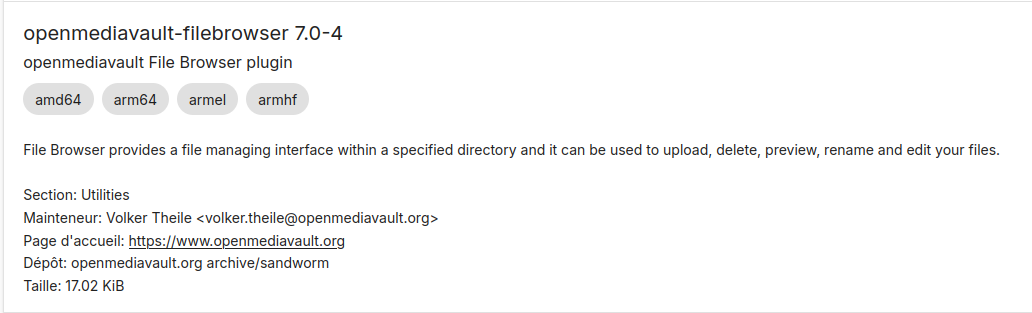 Voici la liste des plugins officiels d'openmediavault. Leur disponibilité dépend de l'architecture sur laquelle openmediavault est installé.