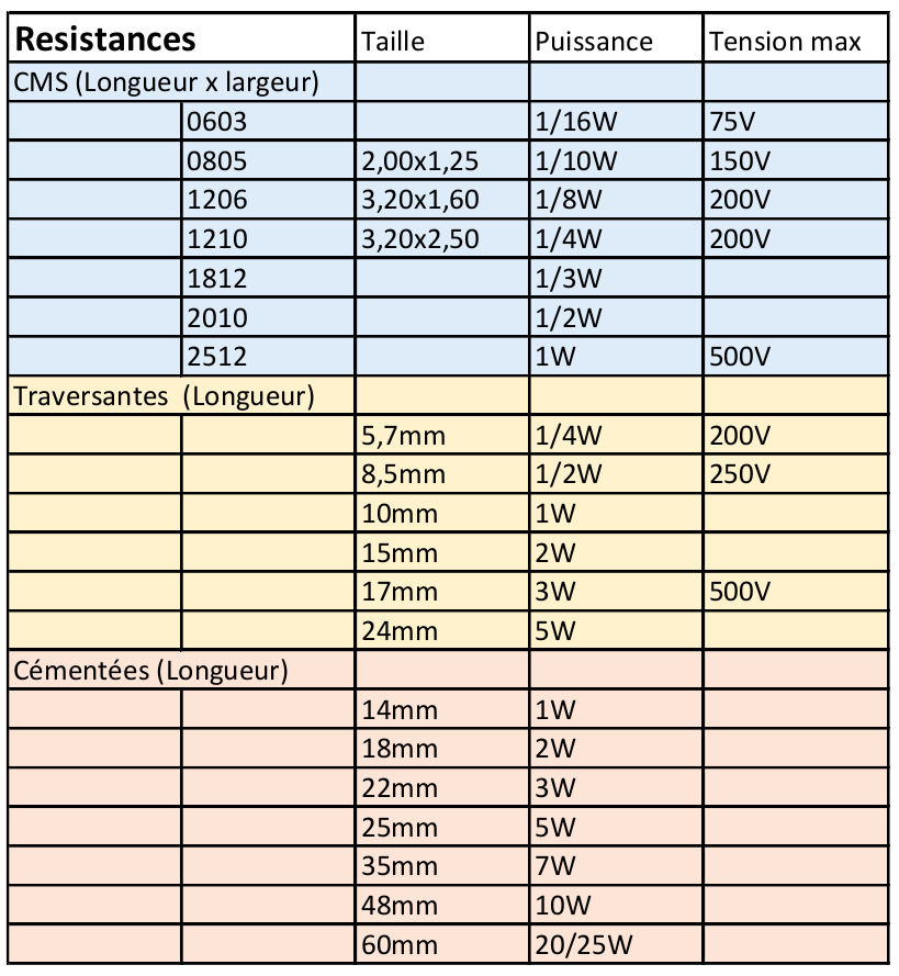 Tableau de resistances : Taille, Puissance, Tension MAX