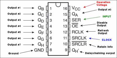 • Il est possible de chaîner plusieurs 74HC595 pour obtenir un registre à décalage 16bits, 24bits, 32bits ou plus.