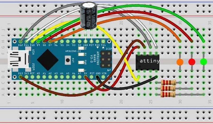 Câblage sur une breakboard pour tester et programmer un ATTiny.