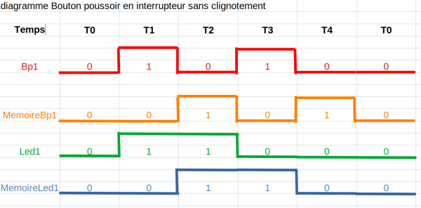 T3 : le Bp1 est actif = 1 ⇒ La memoire du Bp1 est à 0 ( voir Bp1 T2), Led1 est eteinte = 0 ( 2eime fronts montant de Bp1) , la memoire de la Led1 est = 1 ( voir Led1 T2).