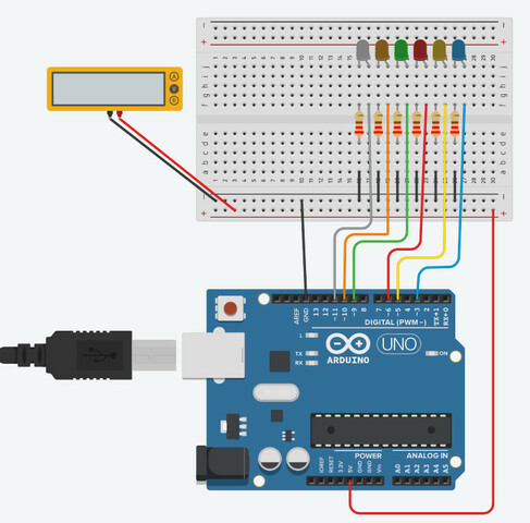 int led1 = 3; // Déclaration de la variable int led2 = 5; // Déclaration de la variable int led3 = 6; // Déclaration de la variable int led4 = 9; // Déclaration de la variable int led5 = 10; // Déclaration de la variable int led6 = 11; // Déclaration de la variable void setup() { pinMode(led1,OUTPUT); // Défini la variable en tant que sortie (OUTPUT) pinMode(led2,OUTPUT); // Défini la variable en tant que sortie (OUTPUT) pinMode(led3,OUTPUT); // Défini la variable en tant que sortie (OUTPUT) pinMode(led4,OUTPUT); // Défini la variable en tant que sortie (OUTPUT) pinMode(led5,OUTPUT); // Défini la variable en tant que sortie (OUTPUT) pinMode(led6,OUTPUT); // Défini la variable en tant que sortie (OUTPUT) } void loop() { digitalWrite(led1, HIGH); delay(200); digitalWrite(led1, LOW); delay(200); digitalWrite(led2, HIGH); delay(200); digitalWrite(led2, LOW); delay(200); digitalWrite(led3, HIGH); delay(200); digitalWrite(led3, LOW); delay(200); digitalWrite(led4, HIGH); delay(200); digitalWrite(led4, LOW); delay(200); digitalWrite(led5, HIGH); delay(200); digitalWrite(led5, LOW); delay(200); digitalWrite(led6, HIGH); delay(200); digitalWrite(led6, LOW); delay(200); }