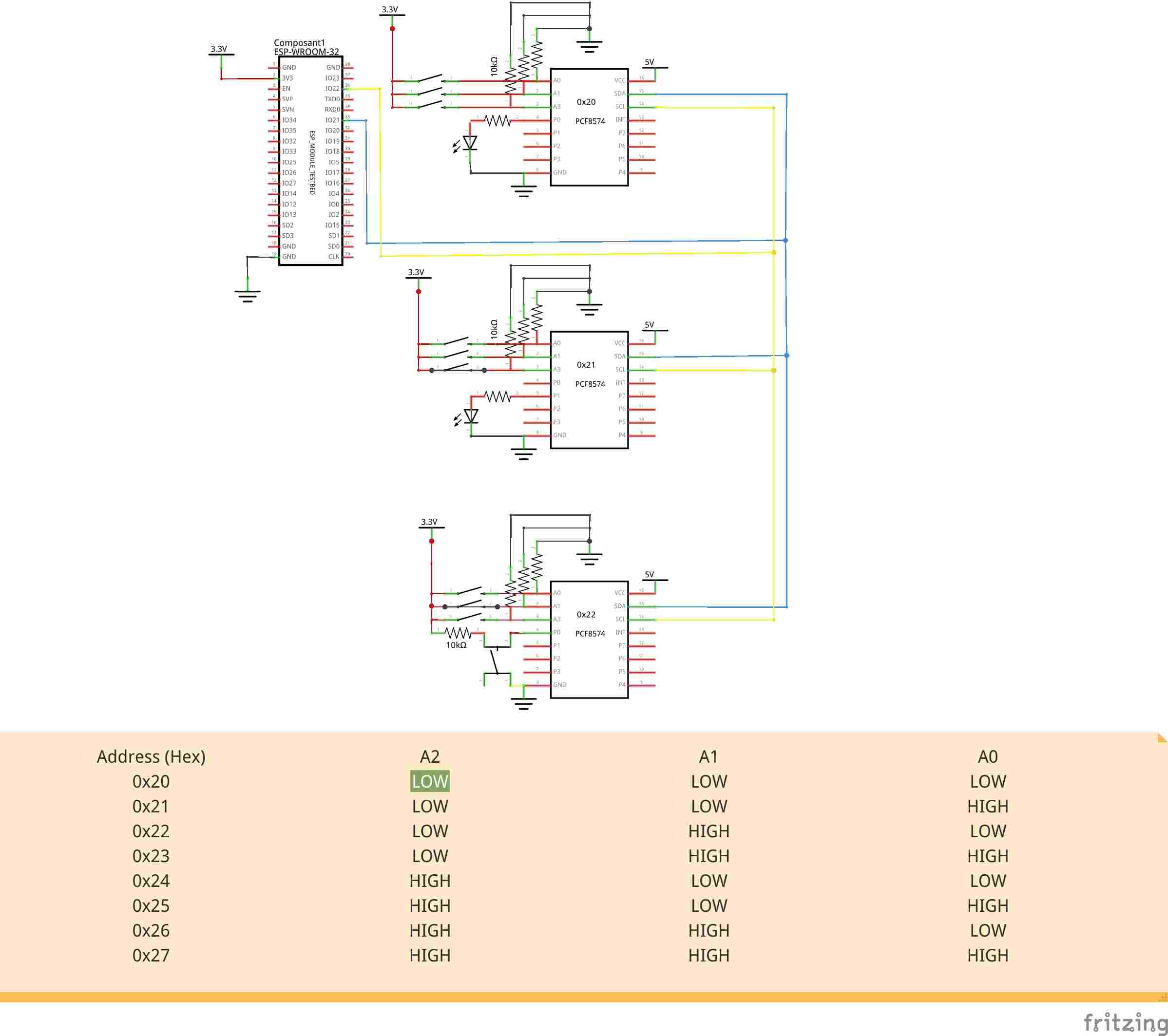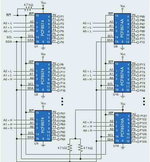 Les trois broches d'adresse matérielle permettent à huit de chaque appareil d'être sur le même bus I 2 C, il peut donc y avoir jusqu'à 16 de ces extenseurs d'E/S PCF8574/PCF8574A ensemble sur le même bus I2C, prenant en charge jusqu'à 128 I/Os.