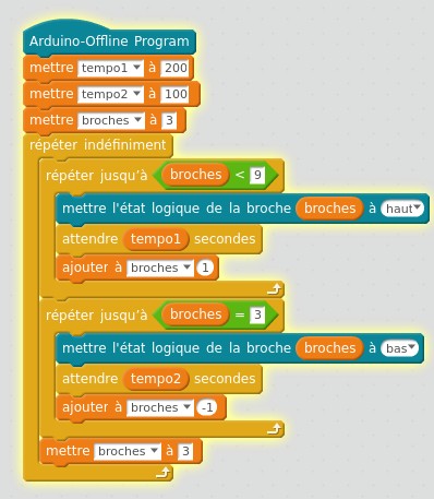 // ce programme allulme les leds une par une int pin[6]={3,4,5,6,7,8}; int temp0=200; //tempo pour allumer les leds int temp1=100; // tempo pour eteindre void setup(){ for (int i = 0 ; i<=5 ; i++){ pinMode(pin[i], OUTPUT); } } void loop(){ for (int i = 0 ; i<=5 ; i++){ // boucle for pour allumer les leds une par une digitalWrite(pin[i], HIGH); delay(temp0); } for (int i = 5 ; i>=0 ; i--){ digitalWrite(pin[i], LOW); delay(temp1); } }