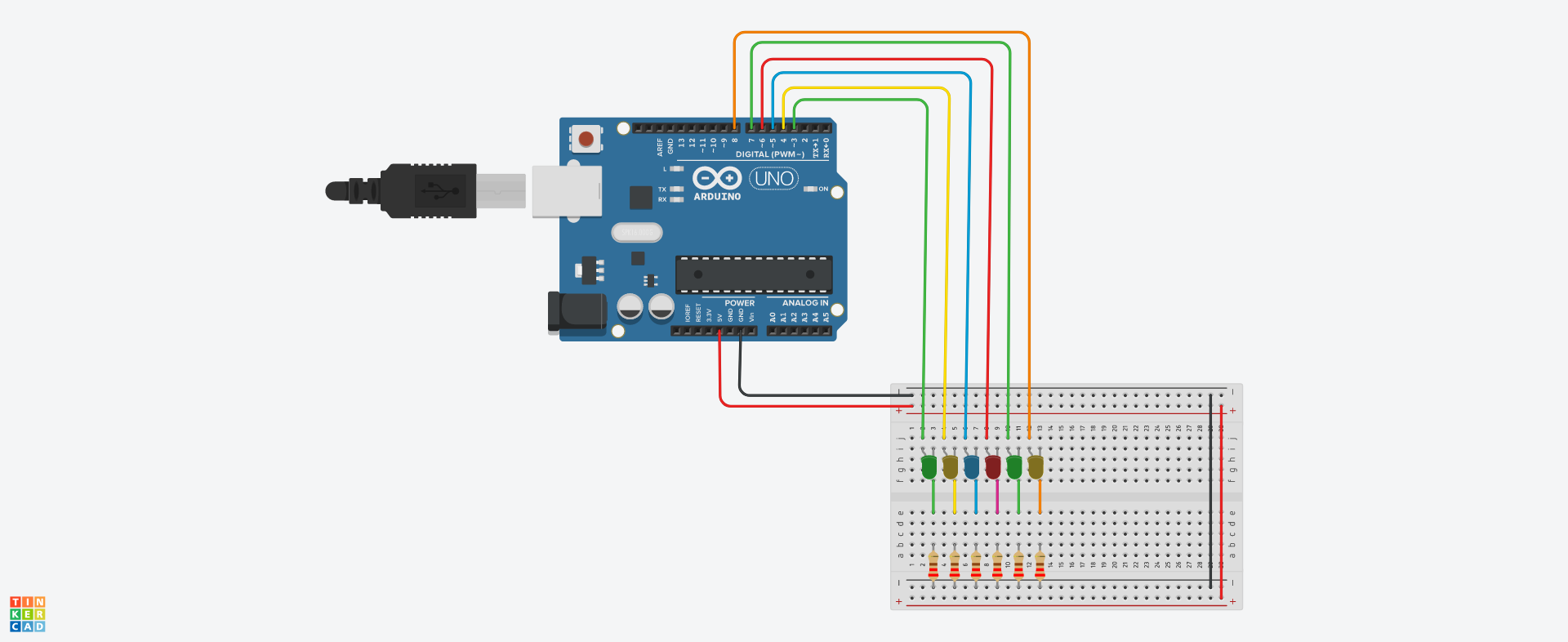 long portPotentiometre = A0; long valeurPotentiometre; void setup() { Serial.begin(9600); pinMode(13, OUTPUT); } // boucle d'allumage void loop() { valeurPotentiometre = analogRead(A0); delay(1); digitalWrite(10, HIGH); delay(valeurPotentiometre); valeurPotentiometre = analogRead(A0); delay(1); digitalWrite(11, HIGH); delay(valeurPotentiometre); valeurPotentiometre = analogRead(A0); delay(1); digitalWrite(12, HIGH); delay(valeurPotentiometre); valeurPotentiometre = analogRead(A0); delay(1); digitalWrite(13, HIGH); delay(valeurPotentiometre); valeurPotentiometre = analogRead(A0); delay(1); digitalWrite(14, HIGH); delay(valeurPotentiometre); // boucle d'arret digitalWrite(10, LOW); delay(valeurPotentiometre); valeurPotentiometre = analogRead(A0); delay(1); digitalWrite(11, LOW); delay(valeurPotentiometre); valeurPotentiometre = analogRead(A0); delay(1); digitalWrite(12, LOW); delay(valeurPotentiometre); valeurPotentiometre = analogRead(A0); delay(1); digitalWrite(13, LOW); delay(valeurPotentiometre); valeurPotentiometre = analogRead(A0); delay(1); digitalWrite(14, LOW); delay(valeurPotentiometre); } }