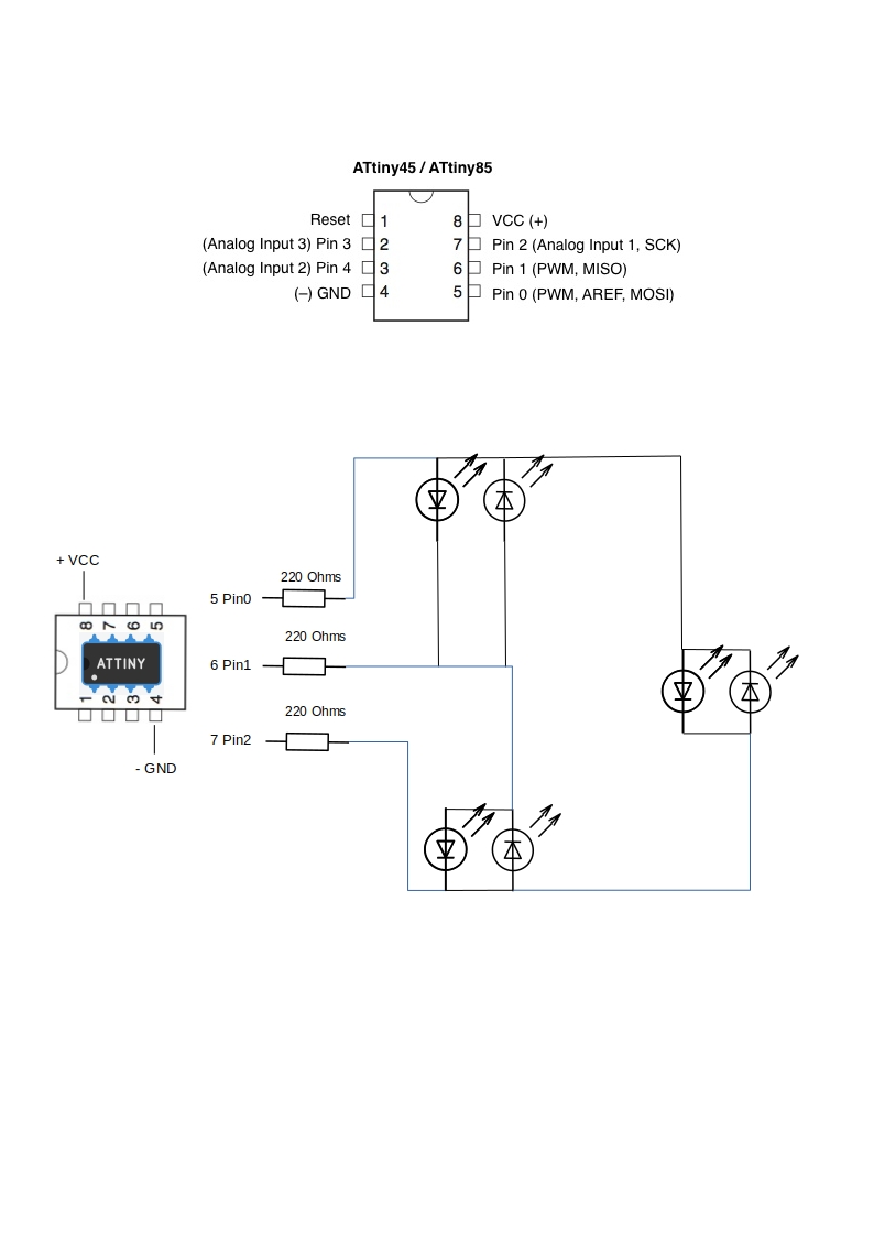 #define LED_1 0 // Pin 0 de l'attiny85 , broche 5 arduino Uno #define LED_2 1 // Pin 1 de l'attiny85 , broche 6 arduino Uno #define LED_3 2 // Pin 2 de l'attiny85 , broche 7 arduino Uno void setup() { pinMode(LED_1, INPUT); pinMode(LED_2, INPUT); pinMode(LED_3, INPUT); } void loop() { set_pins(LED_1, LED_2); delay(100); set_pins(LED_2, LED_1); delay(100); set_pins(LED_3, LED_1); delay(100); set_pins(LED_1, LED_3); delay(100); set_pins(LED_2, LED_3); delay(100); set_pins(LED_3, LED_2); delay(100); } void set_pins(int high_pin, int low_pin) { reset_pins(); pinMode(high_pin, OUTPUT); pinMode(low_pin, OUTPUT); digitalWrite(high_pin, HIGH); digitalWrite(low_pin,LOW); } void reset_pins() { pinMode(LED_1, INPUT); pinMode(LED_2, INPUT); pinMode(LED_3, INPUT); digitalWrite(LED_1, LOW); digitalWrite(LED_2, LOW); digitalWrite(LED_3, LOW); }