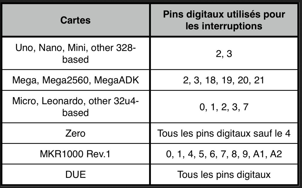Si vous créez un projet qui repose fortement sur des données de capteurs précises et que vous devez donc vous assurer de lire et d'enregistrer toute variation de valeur, il peut être difficile d'écrire un programme capable de faire autre chose correctement. En effet, le microcontrôleur est constamment occupé à lire les valeurs. Pour contourner ce problème, vous pouvez utiliser des interruptions qui peuvent vous aider à lire les entrées d'un encodeur rotatif ou d'un bouton-poussoir, par exemple, sans avoir à insérer de code dans votre fonction de boucle.