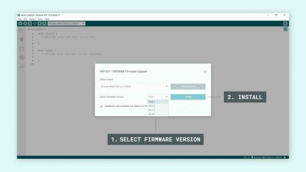 Vous pouvez mettre à niveau et rétrograder la version du micrologiciel de vos cartes Wi-Fi (avec un module NINA) et télécharger des certificats racine SSL directement dans l'IDE.