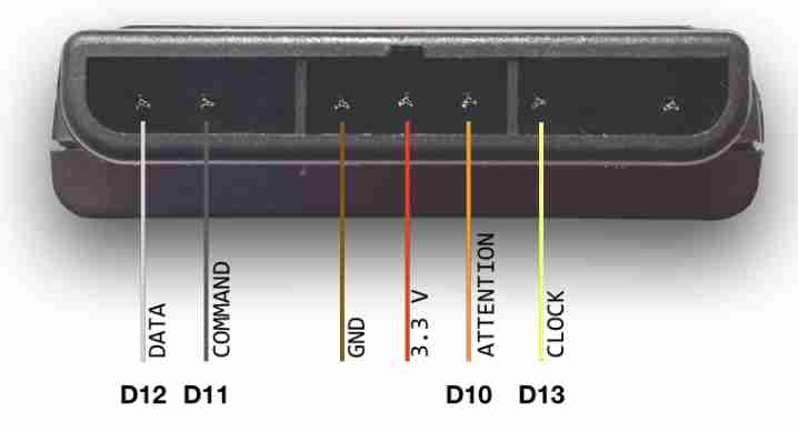 Le contrôleur sans fil PS2 communique avec Arduino en utilisant un protocole qui est essentiellement SPI. La station de jeu envoie un octet en même temps qu'elle en reçoit un (duplex intégral) via une communication série. Il y a une horloge (SCK) pour synchroniser les bits de données sur deux canaux : DATA et CMD. De plus, il existe un canal “Attention” (ATT) qui indique à l'esclave s'il est “actif” ou non et doit écouter les bits de données traversant le canal CMD, ou envoyer des bits de données via le canal DATA (raisonnablement, un seul périphérique esclave doit être actif à la fois). La PlayStation 2 l'utilise en fait plus une ligne supplémentaire qui ne fait pas spécifiquement partie du protocole SPI - une ligne “Acknowledge” (ACK).