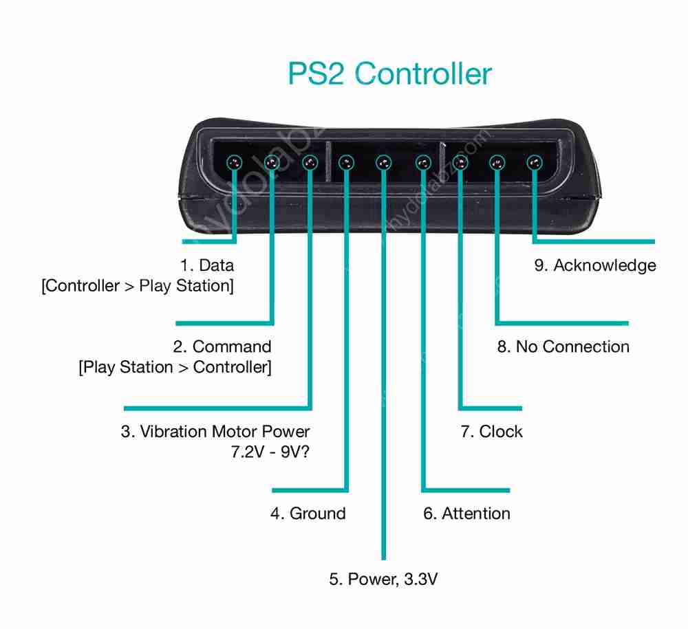 - - ACK : Reconnaître le signal du contrôleur à la PS2. Cette ligne normalement haute chute environ 12 us après chaque octet pendant un demi-cycle d'horloge, mais pas après le dernier bit d'un ensemble. Il s'agit d'une sortie à collecteur ouvert et nécessite une résistance pull-up (1 à 10k, peut-être plus).