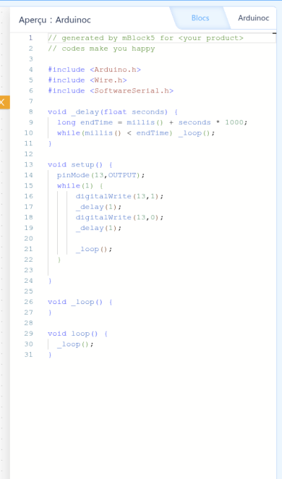 vous pouvez voir votre programme en mode Arduino en cliquant sur ( Coté droit de la fenetre avec une carte arduino UNO pas avec mBot ….) :