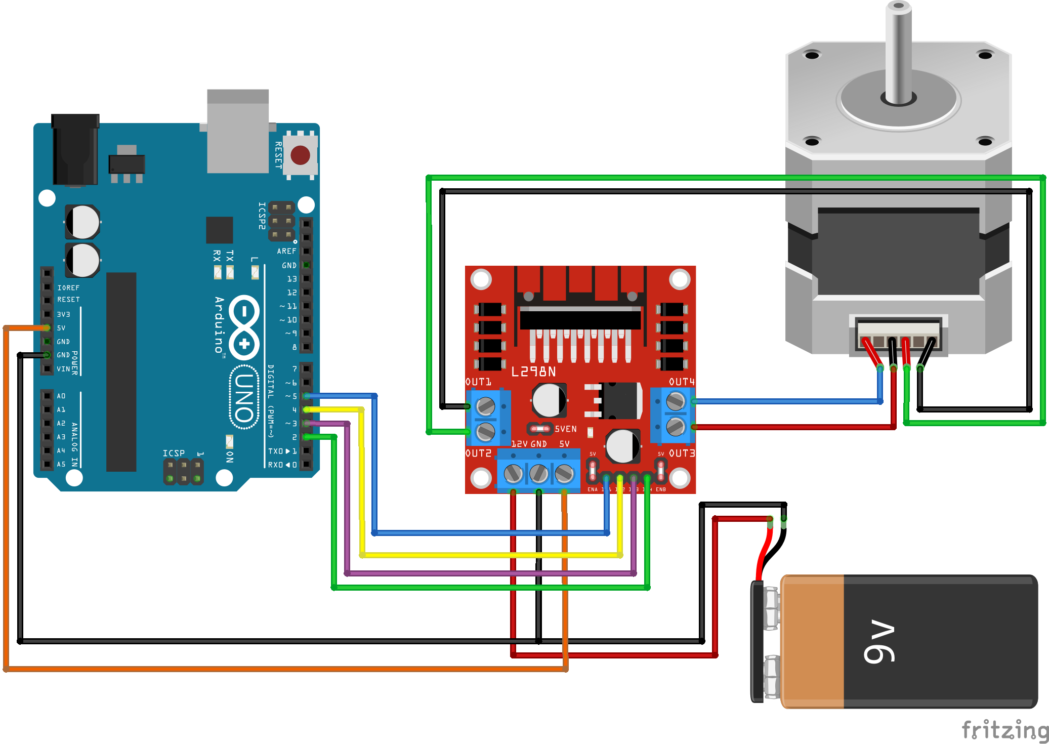 - CW- et CW+ : Connectez CW- à la masse (GND) d’Arduino et CW+ à une broche d’Arduino (par exemple, broche 2) pour contrôler la direction de rotation.