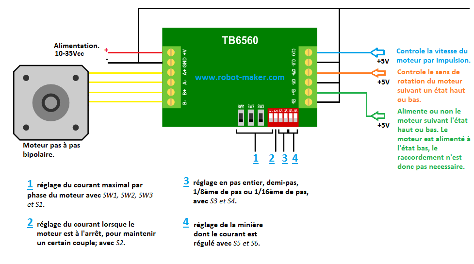 - VCC (Tension d’Alimentation) : Connectez une source d’alimentation de 10 à 35 VDC à la broche VCC du TB6560 pour alimenter le moteur.