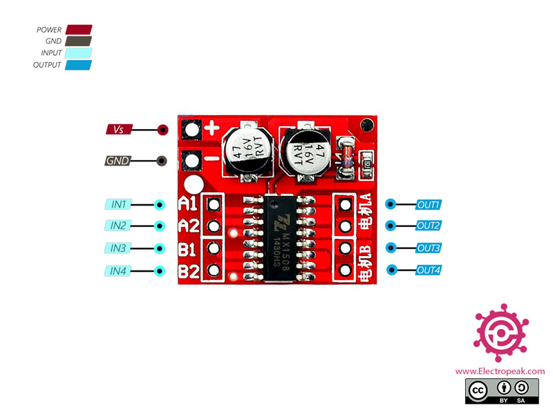 Le MX1508 est un pilote de moteur à double pont complet qui permet de connecter simultanément deux moteurs à courant continu.