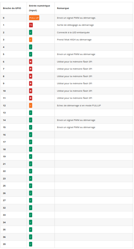 Attention toutefois car certaines broches passent à l’état haut (HIGH) ou émettent des signaux PWM au démarrage ou lors de la réinitialisation. D’autres broches sont utilisées par le système pour accéder à la mémoire flash ou téléverser le programme.