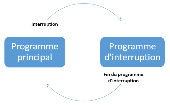 Détection d’un évènement → Interruption du programme principal → Exécution du code de l’interruption → Le processeur reprend là où il s’est arrêté.