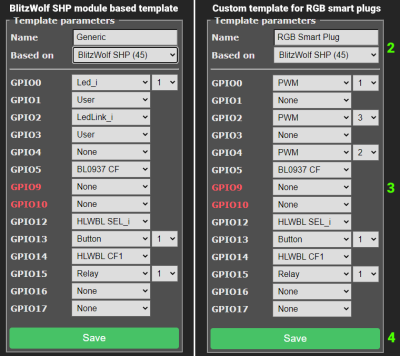 • Tout GPIO inutilisé qui ne peut pas avoir de périphérique connecté doit être défini sur None(0). Dans notre exemple, l'appareil n'a pas de GPIO exposés, donc ceux qui ne sont pas utilisés sont définis par 0rapport au module BlitzWolf d'origine.