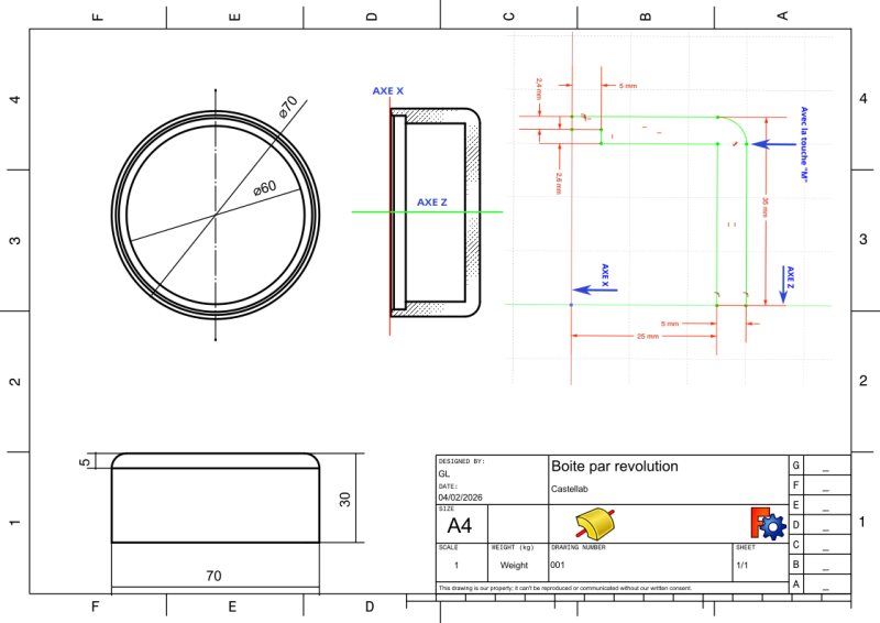 - Créer un cercle par son centre de 70 mm de diamètre