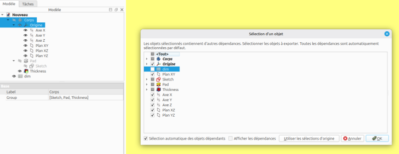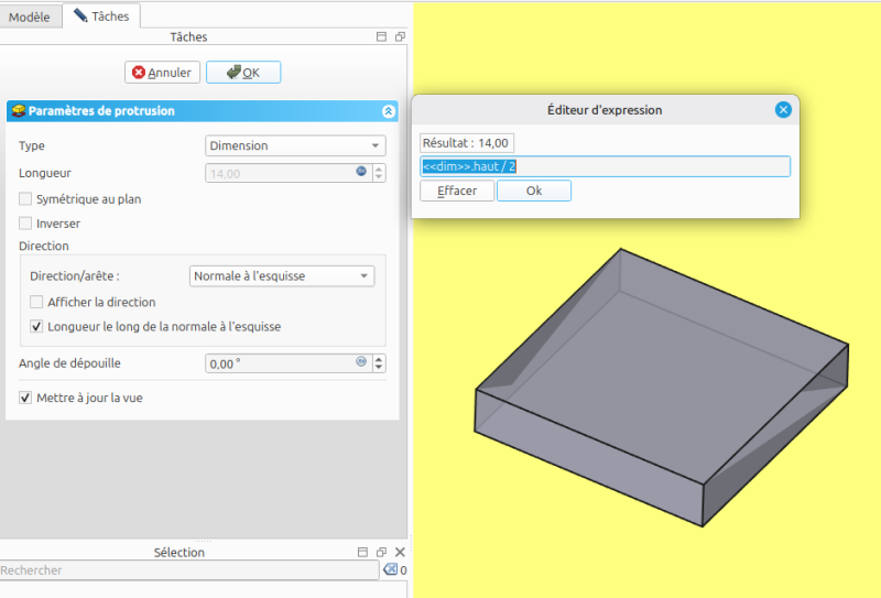 - Créer un protusion utiliser «dim».bhauteur (de 50 mm) Inverser ( en dessous du plan XY ) Atelier “PartDesign”