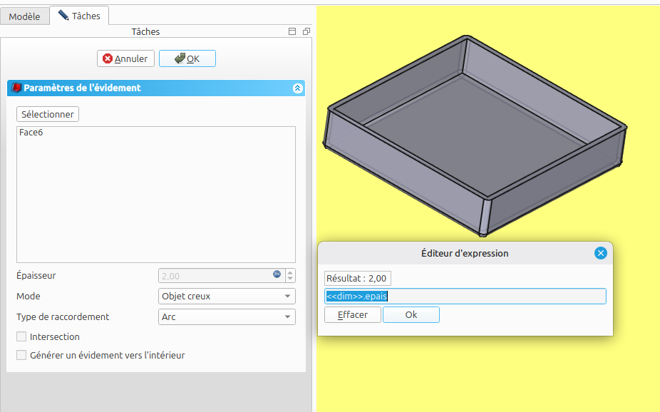 - Créer un évidement utiliser «dim».bepais (de 3 mm) d'epaisseur