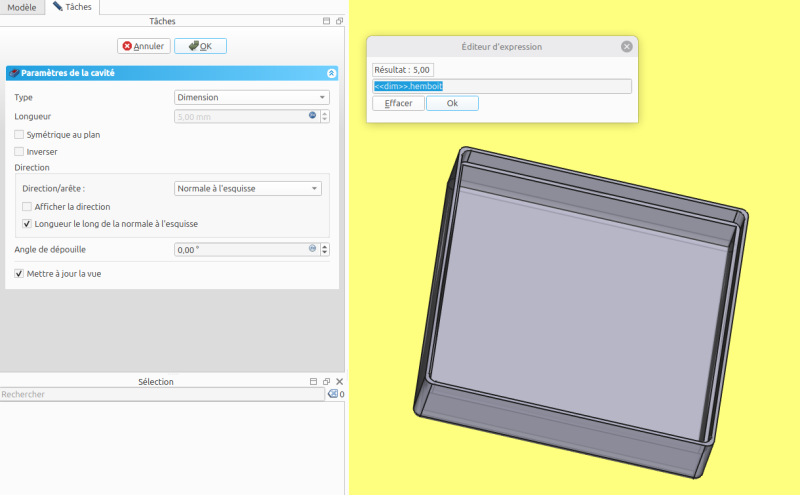 - Créer une cavité utiliser «dim».bhautcavite (de 5 mm ) Atelier “PartDesign”