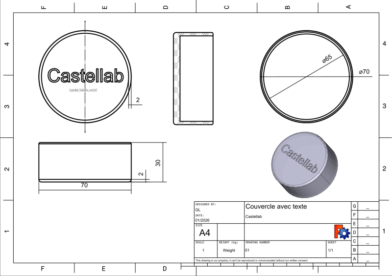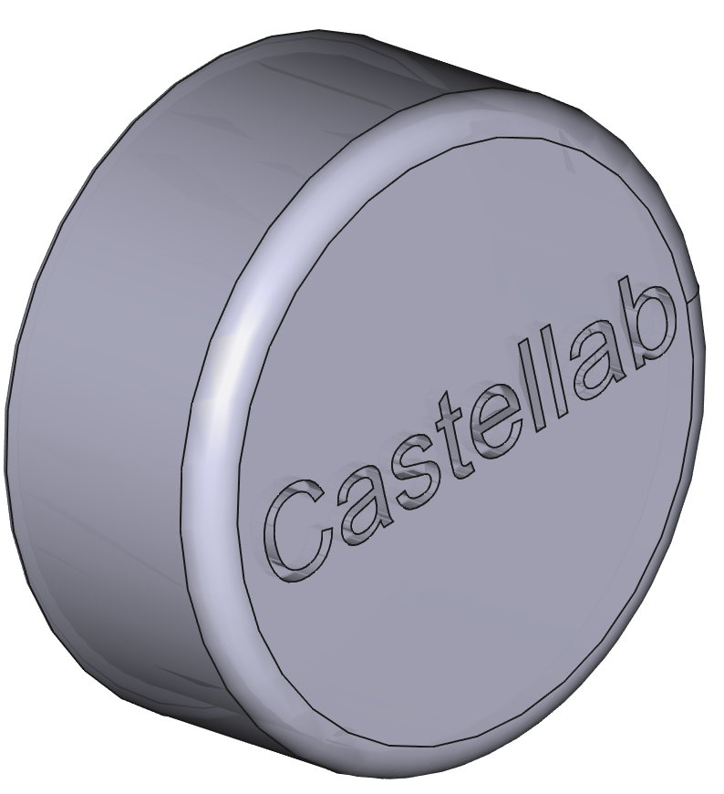 - Sélectionner “Cavité” Type = “Dimension” Longueur = 2 mm ( Le texte “Castellab” devrait être incrusté dans le cylindre)