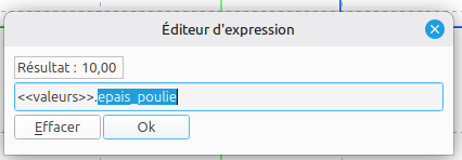 Nous appelons alors notre variable ‘epaisseur poulie’ en saisissant : valeurs.epais_poulie ce qui signifie qu’on va aller chercher dans la feuille de calcul ‘valeurs’, la valeur saisie dans la cellule ayant pour alias ‘hauteur‘. On notera que l'autocomplétion proposée facilite la saisie de la formule.