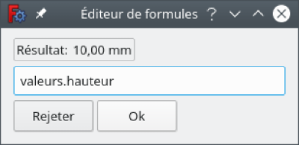 Nous retournons modifier notre esquisse et allons y ajouter cette fois les contraintes liées aux variables. Par exemple nous fixons la distance verticale du segment vertical gauche de notre esquisse, mais au lieu de saisir la valeur numérique, nous cliquons sur le symbole f(x) situé à droite du champs de saisie pour afficher un éditeur de formule.