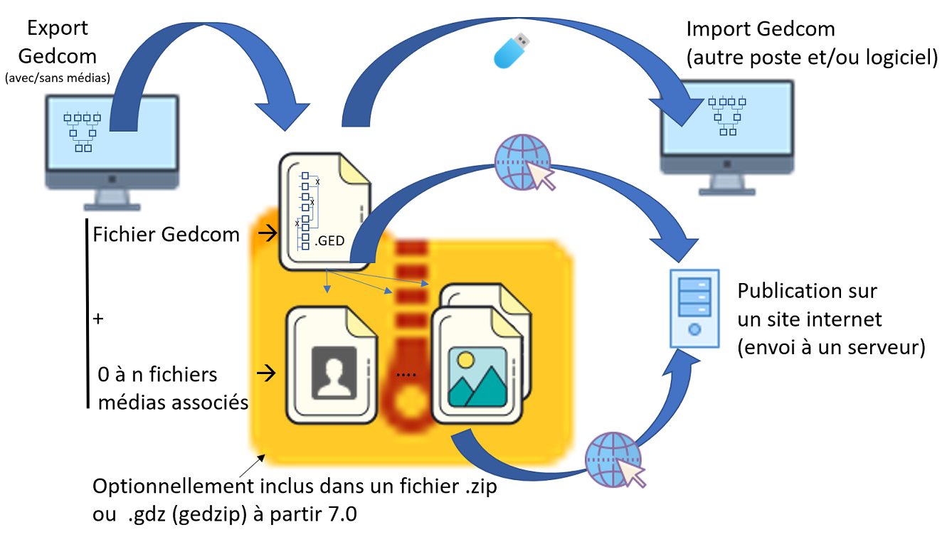 Les fichiers GEDCOM sont des fichiers contenant du texte brut (extension .ged) écrit avec un vocabulaire décrivant, principalement, des individus, des familles et les liens entre eux. Ils contiennent également les chemins d'accès vers des fichiers associés comme les images d'actes ou les portraits. La plupart des logiciels de généalogie intègrent les fonctions permettant d'exporter ou d'importer ces fichiers. Trois versions du format (5.5, 5.5.1 et 7.0) sont principalement utilisées par les logiciels et sites de généalogie. Dans les versions 5, les spécifications ne définissent pas comment transmettre les médias avec le Gedcom. A partir de la version 7, il est possible d'exporter gedcom et médias associés dans un seul fichier .gdz (gedzip). La figure suivante illustre le principe général avec optionnellement l'association de médias au fichier Gedcom :