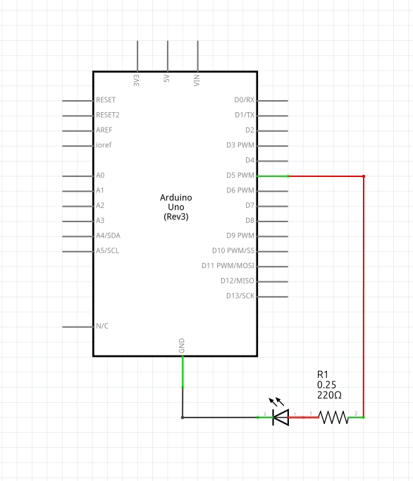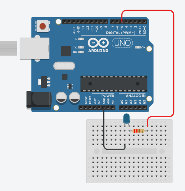 // C++ code // void setup() { pinMode(5, OUTPUT); } void loop() { analogWrite(5, 1); delay(1000); // Wait for 1000 millisecond(s) analogWrite(5, 0); delay(1000); // Wait for 1000 millisecond(s) }