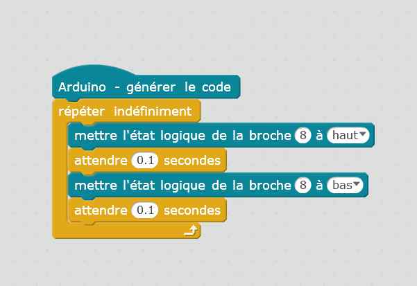 // C++ code // void setup() { pinMode(8, OUTPUT); } void loop() { digitalWrite(8, HIGH); delay(50); // Wait for 50 millisecond(s) digitalWrite(8, LOW); delay(50); // Wait for 50 millisecond(s) }