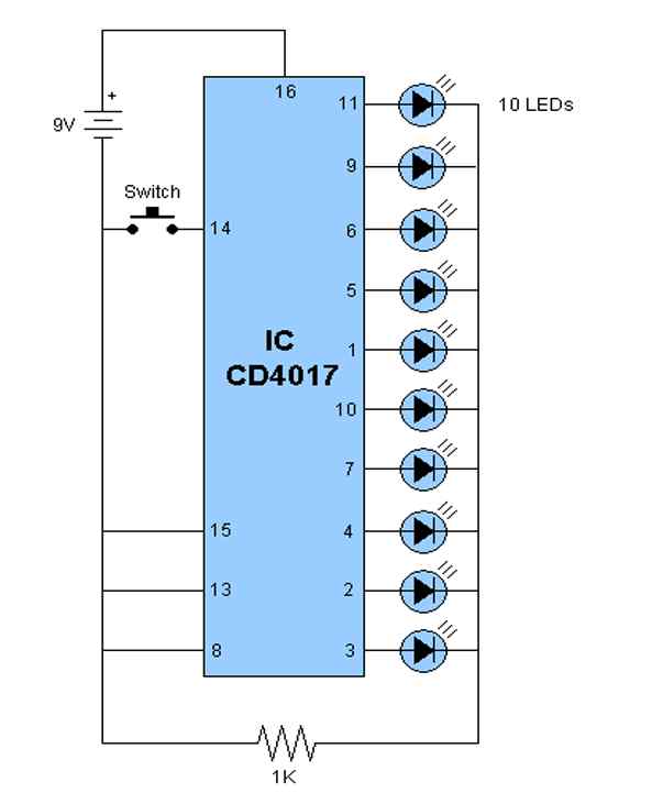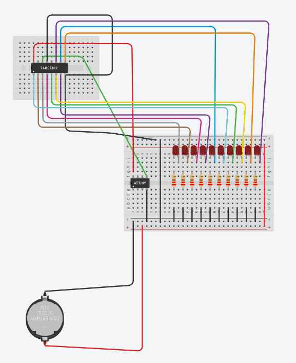 Ce montage utilise un 74HC4017 commandé par un Attiny ( petit arduino) , un Arduino Uno aurait fait l'affaire, 10 leds et 10 resistances 220 Ohms et une pile bouton CR2032 3V