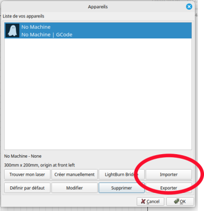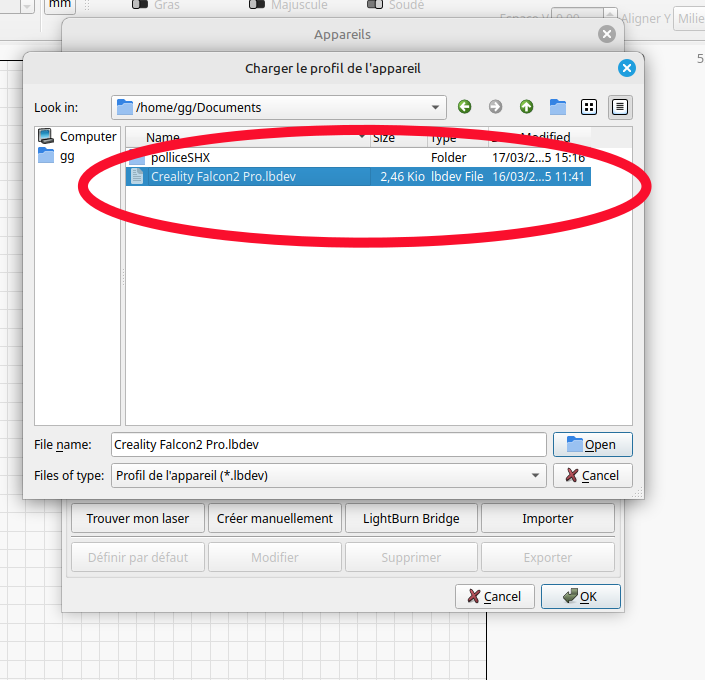 -3- Choisir le fichier profil “Creality_Falcon2_Pro.lbdev” puis le bouton “Open”