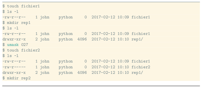 On peut voir sur cet exemple que le fichier fichier1 et le répertoire rep1 se voient attribuer les droits par défaut déterminés par le masque 022. Après l’exécution de la commande umask 027, les nouveaux fichiers et répertoires ont respectivement les droits 640 et 750, ce qu’on observe pour fichier2 et rep2.
