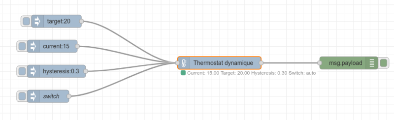 Un module Node-RED, un thermostat dynamique, vous permet de définir une température souhaitée ( msg.payloadhystérésis) msg.payloadet la température actuelle msg.payloadpour activer ou désactiver le chauffage. Il est donc très dynamique et vous n'avez pas besoin de paramétrer le nœud lui-même.