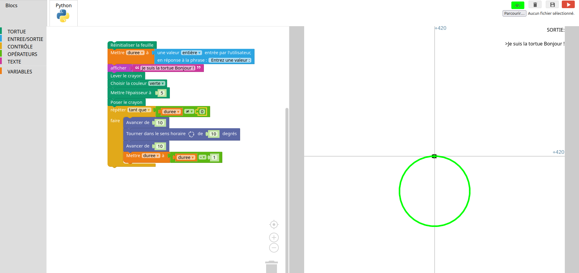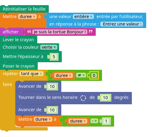 import turtle "" 0 turtle.reset() duree = int(input(" Entrez une valeur :")) print("Je suis la tortue Bonjour !") turtle.up() turtle.color("green") turtle.width(5) turtle.down() while duree != 0: turtle.forward(10) turtle.right(10) turtle.forward(10) duree = duree - 1 0 == 0 0 == 0