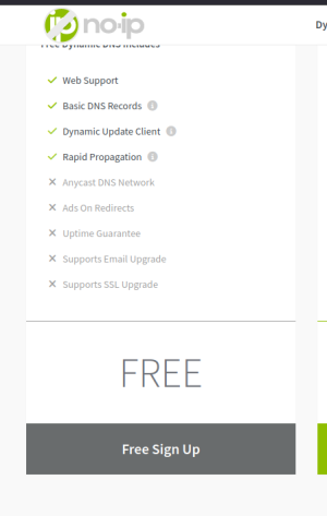 Vous arrivez alors sur une page proposant plusieurs offres. Choisissez la colonne Free DNS, et cliquez sur « Sign Up ».