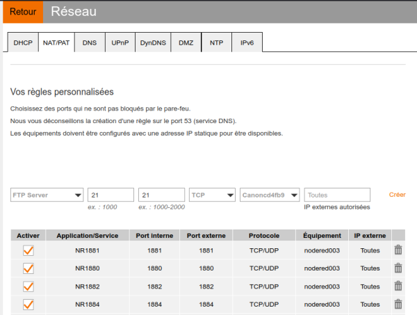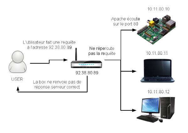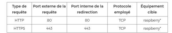 Dans un premier temps, il va donc falloir faire en sorte que lors d’une requête sur votre box, qui est la seule à être accessible depuis l’extérieur, celle-ci soit redirigée vers votre Raspberry Pi, pour qu’elle soit traitée par le service adapté.