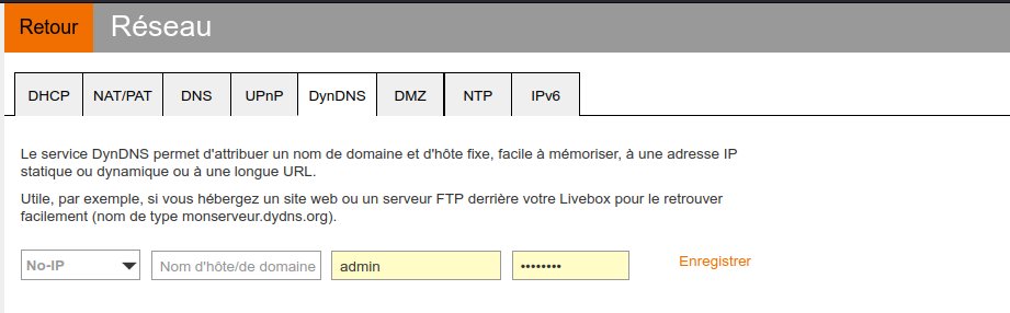 Pour cela, il va de nouveau falloir accéder à l’interface de votre box, puis à une section qui sera probablement définie comme « DynDNS ». Une fois ceci fait, choisissez l’utilisation de No-IP, puis renseignez comme nom d’hôte l’adresse « Hostname » que vous aviez définie sur noip.com, ainsi que les identifiants du compte noip.com.