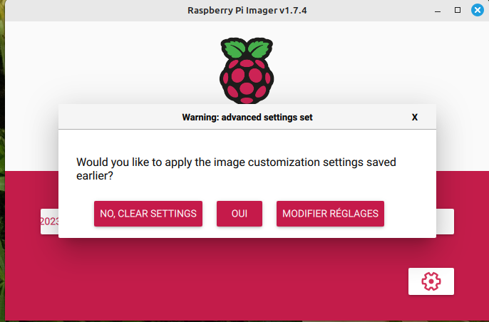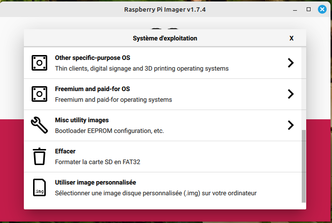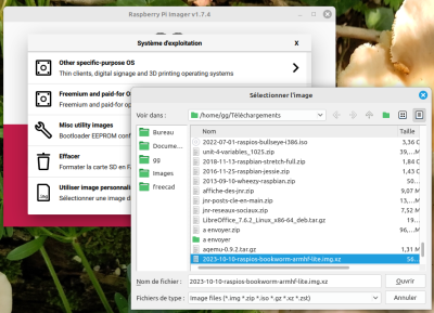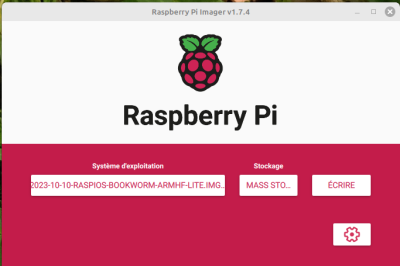 - Utiliser une image personnalisée =⇒ 2023-10-10-raspios-bookworm-armhf-lite.img.xz ( Octobre 2023)