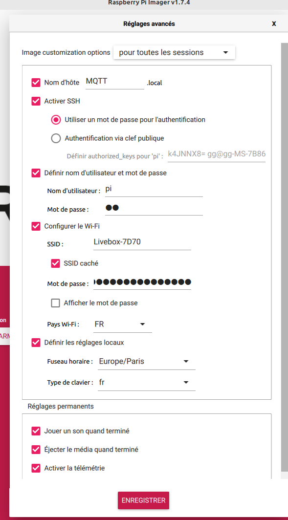 - Indiquer le nom d hôte du Raspberry, activer SSH, definir un utilisateur et son mot de passe, , configurer le wifi, definir les reglages Locaux ( FR), ne pas oubliez de cliquer sur “ENREGISTRER”