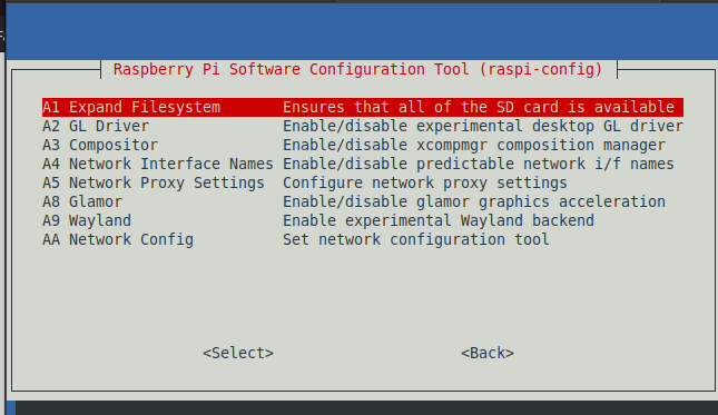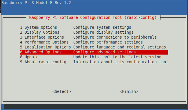 pour finir de configurer le raspberry, modifier dans l'option “ 6 Avanced options” et dans l'option “ A1 Expand Filesystem” la taille de la partition de votre carte SD