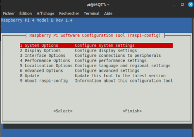 - On fait un “sudo raspi-config” pour finir de configurer le raspberry, pour modifier dans “Avanced options” la taille de la partition et on reboot