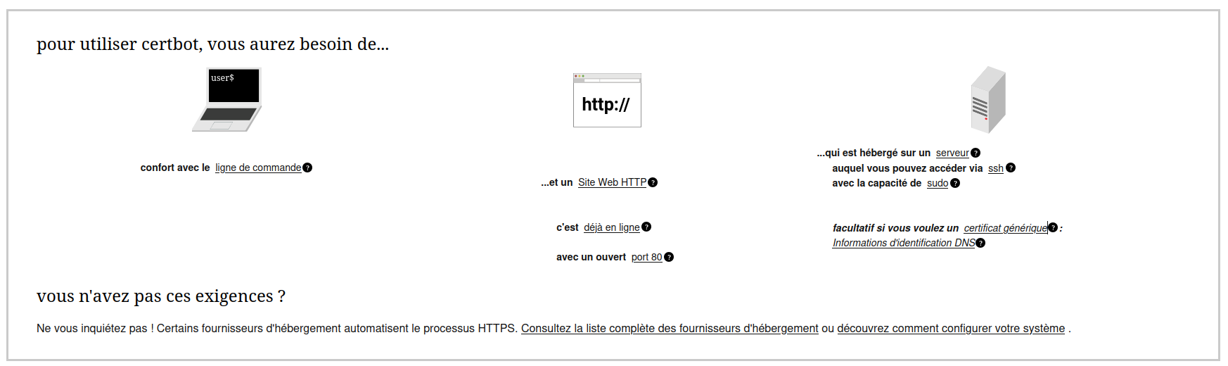 Nous recommandons à la plupart des gens de commencer par le client Certbot. Il peut simplement vous obtenir un certificat ou aussi vous aider à l’installer, selon votre préférence. Il est facile à utiliser, fonctionne sur de nombreux systèmes d’exploitation et dispose d’une excellente documentation.