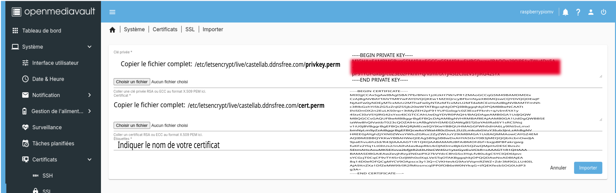 Les certificats Lets Encrypt peuvent être importés directement, il suffit de localiser vos fichiers et de copier leur contenu dans leur champ respectif. Pas besoin de conversion.