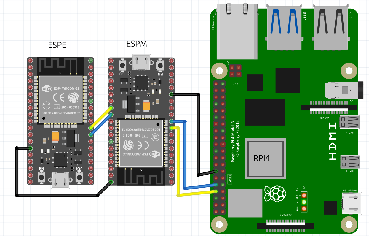 Raspberry Pi 4 → ESP32M ←- ESP32E:
