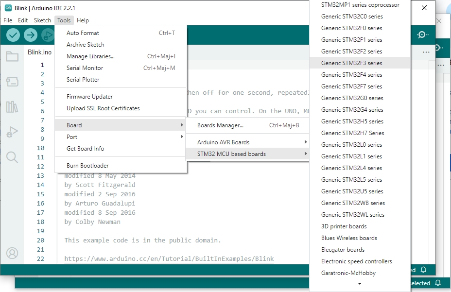 -3- Dans “Outils” –> “Carte” choisir “STM32 MCU Based Board” et “Nucleo 144”