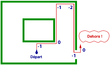 il ne suffit pas de marcher en ligne droite. Il faut compter les changements de direction. Supposons que, comme dans les exemples précédents, tous les angles soient droits. On n’a alors que deux possibilités, tourner à droite ou à gauche selon un angle de 90°. On compte les changements de direction en augmentant d’un point lorsque l’on tourne à gauche et en diminuant d’un point lorsque l’on tourne à droite (y compris la première fois que l’on tourne à droite quand on atteint un mur). Au début, le décompte est à zéro. Les deux instructions sont alors les suivantes : *1 Aller tout droit jusqu’au mur, passer à l’instruction 2 ; *2 Longer le mur par la droite (ou par la gauche, mais toujours dans le même sens) jusqu’à ce que le décompte des changements de direction atteigne zéro, passer à l’instruction 1 ; Il faut répéter ces actions jusqu’à ce que l’on revienne à la lumière du jour.