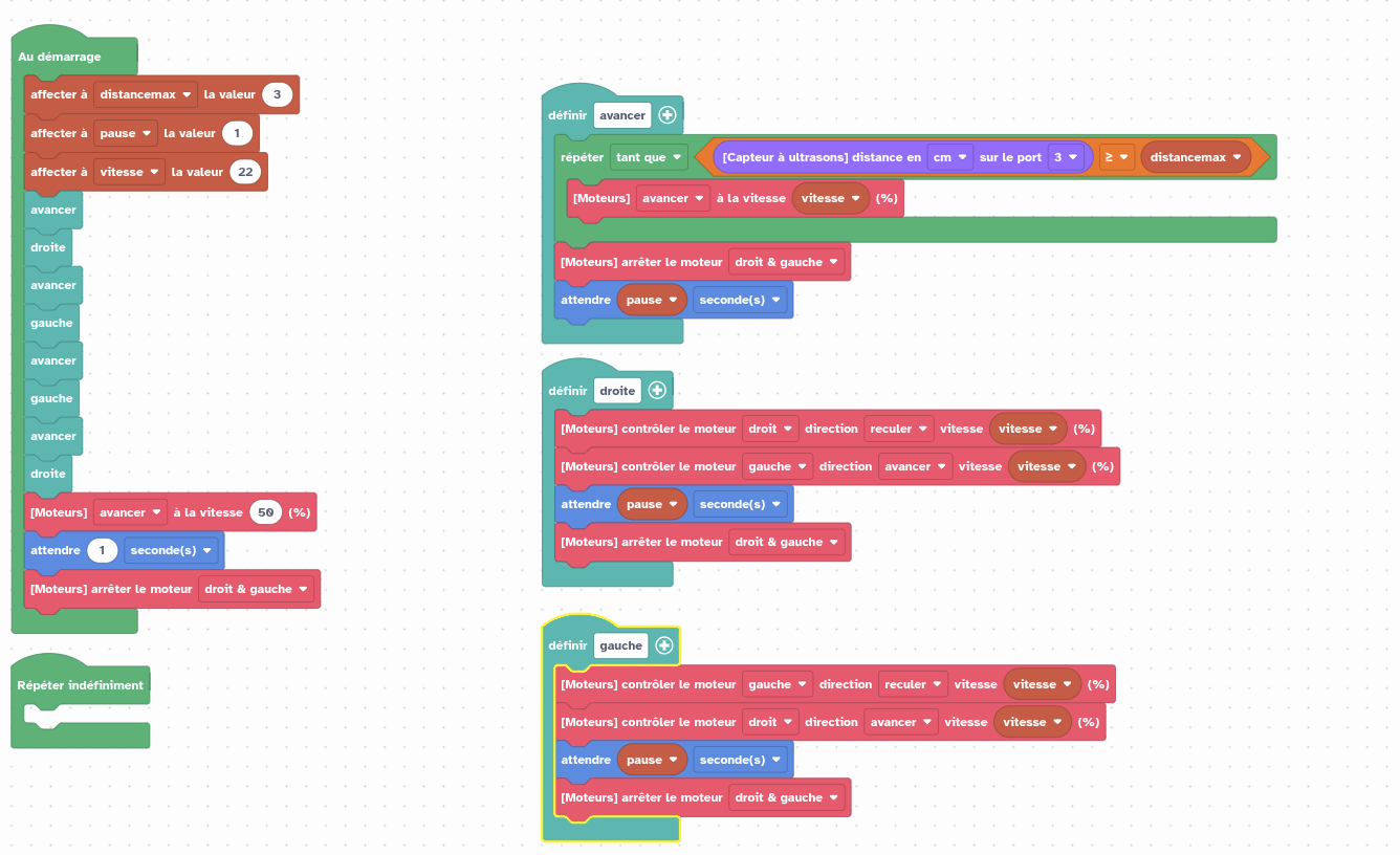 - 2- Création de sous programmes : avancer , reculer, tourner droite 90° , tourner gauche 90°, stop, test distance